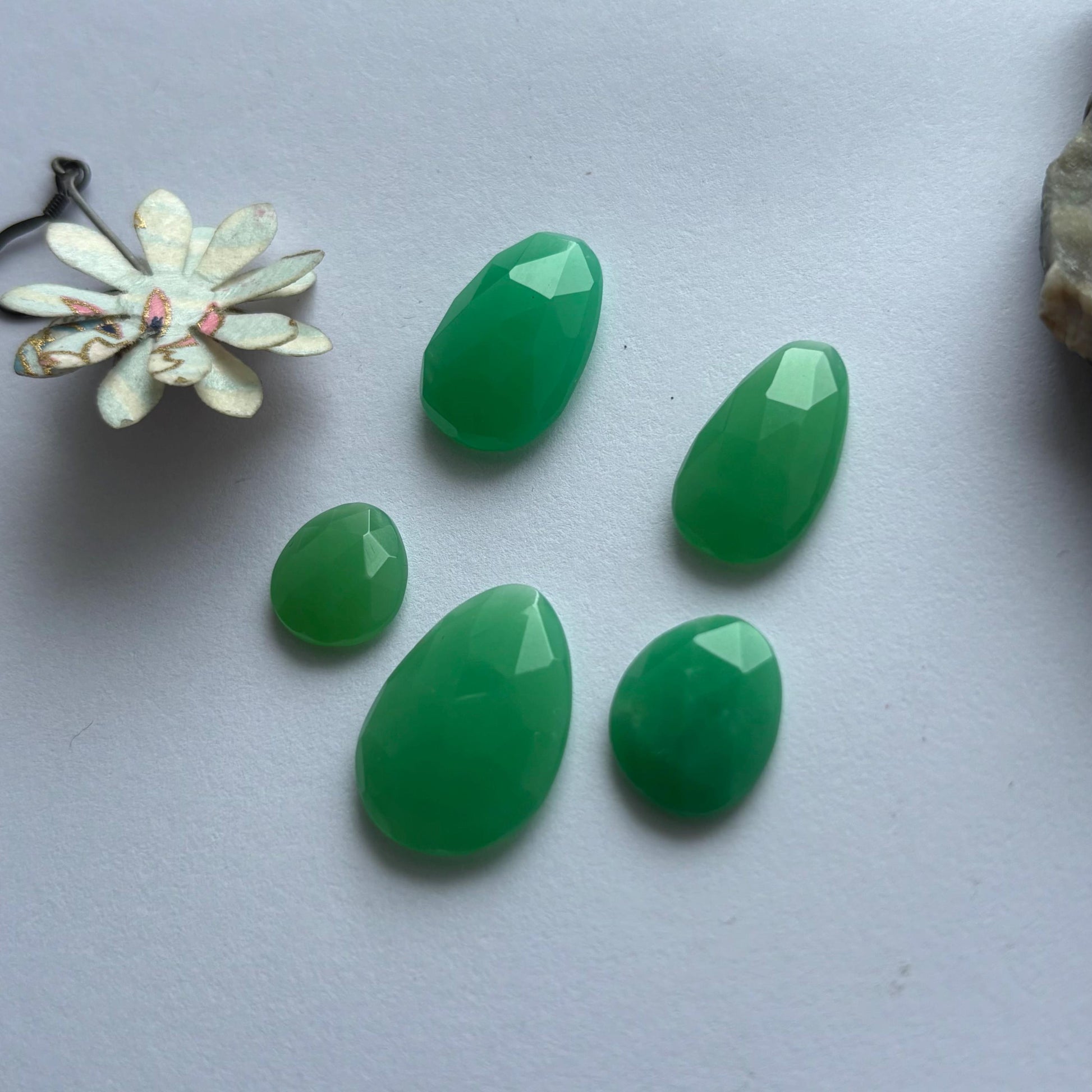 Discover the natural charm of Handmade Rose Cut Chrysoprase Stones — each uniquely shaped and cut to highlight the stone’s organic beauty. Their soft apple-green tones and uneven, free-form silhouettes make them perfect for artisanal and boho-style Jewelry.