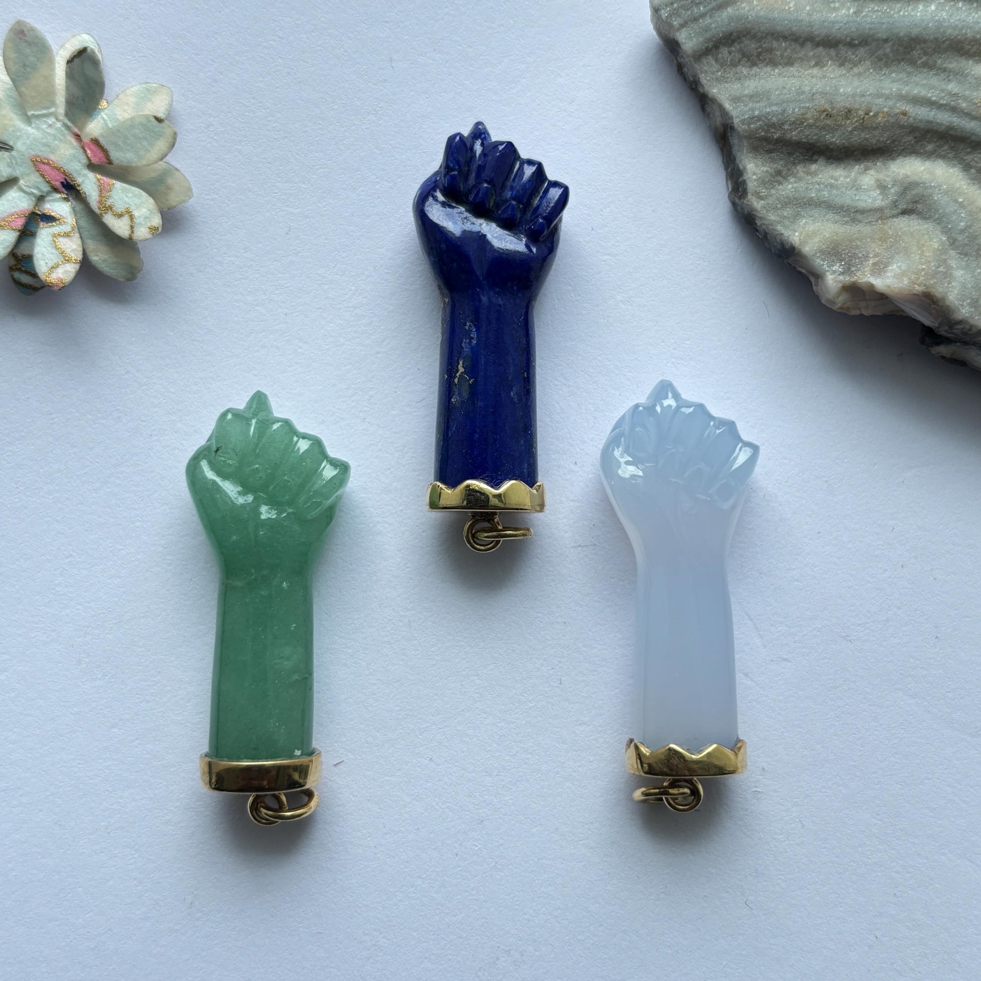 Hand carved Figa Hand Charm Pendant set in 14K Solid Gold in Lapis,Chalcedony and Aventurine
