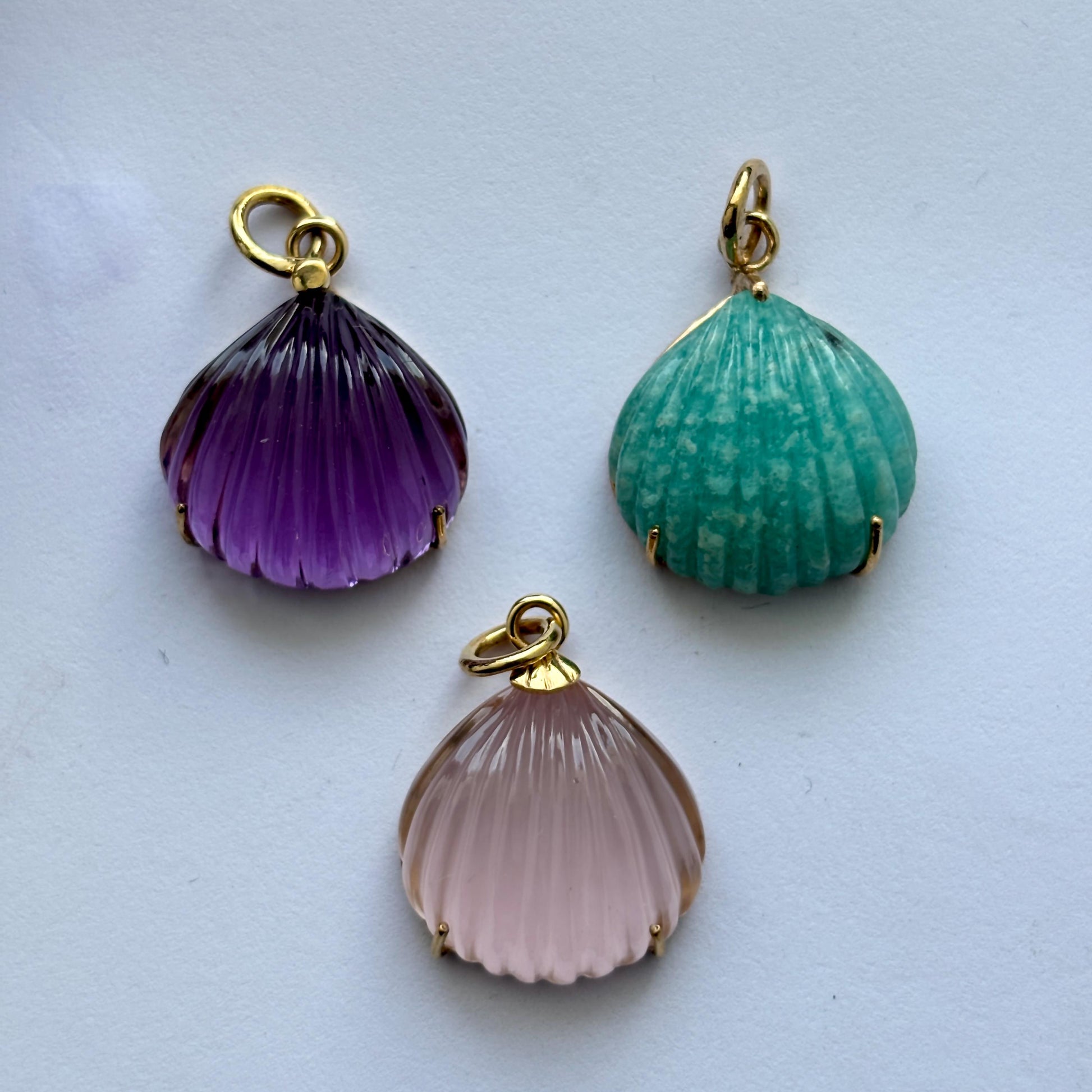Hand Carved Shell Pendant in Natural Amethyst, Rose quartz, Amazonite 14k Solid Gold Jewellery, Handcut In Premium Quality Gemstones