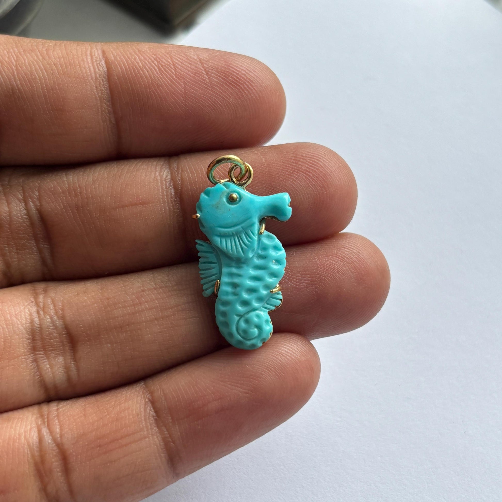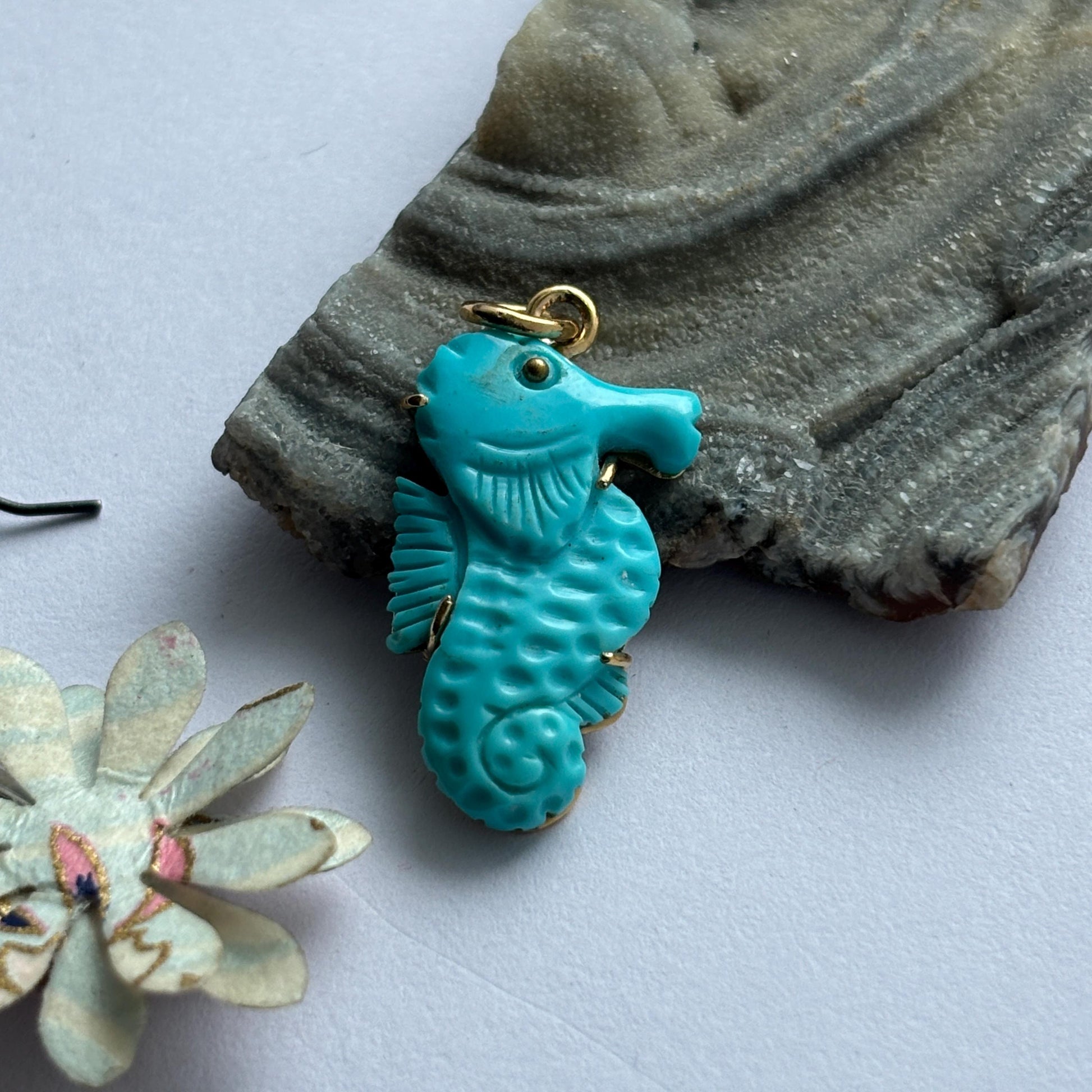 Seahorse Charm Hand Carved in Natural Arizona Turquoise | Sterling Silver & Solid Gold Bail Loop | Ocean-Inspired Pendant